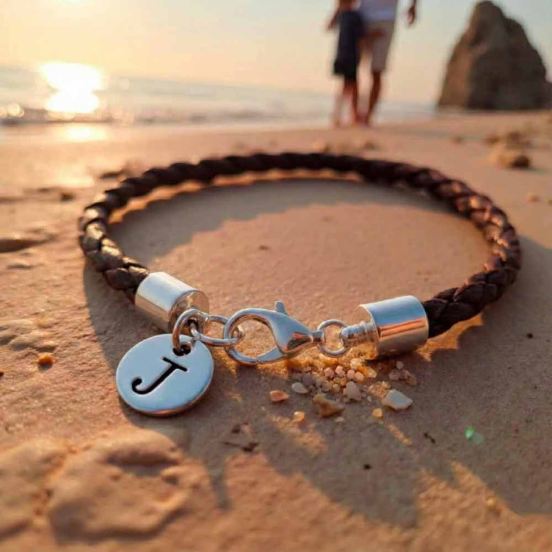 4 mm braided leather bracelet with a silver clasp and a central 9 mm sterling silver medal, perfect for engraving an initial, name, or date. You can personalize the front engraving at no extra cost and add back engraving for an additional fee.