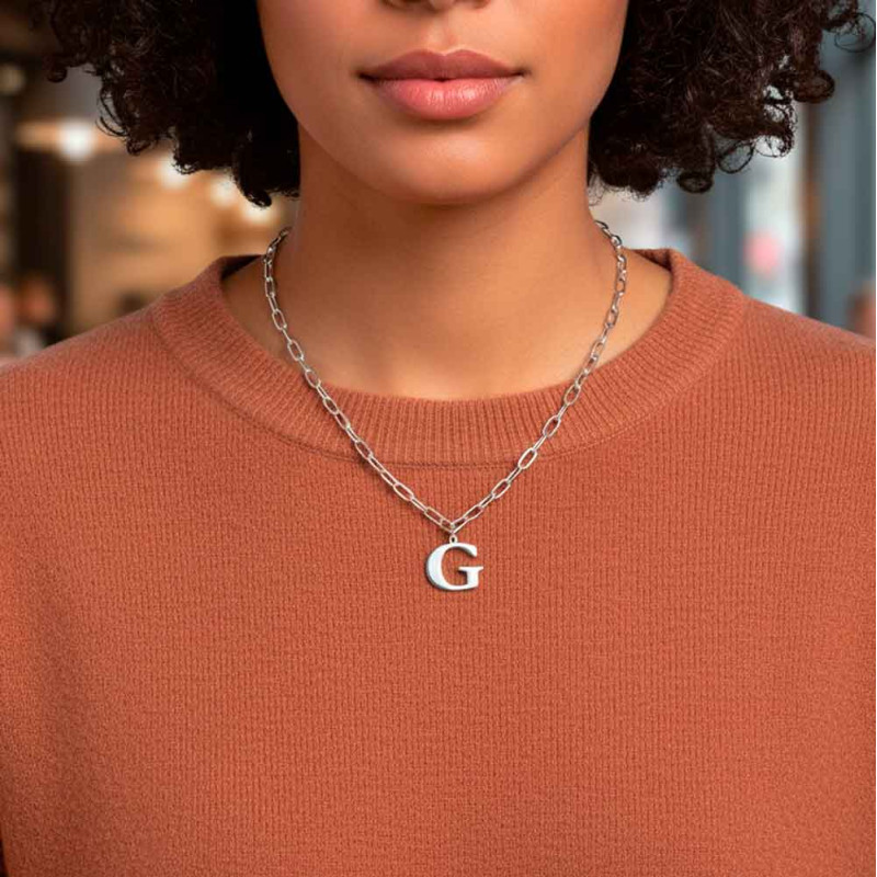 Personalized Letter Necklace made of sterling silver. The letter measures 15 mm high and 0.8 mm thick, and includes a box chain available in 40, 45, or 50 cm lengths. Indicate the desired initial in the customization area; the default font is Garamond.