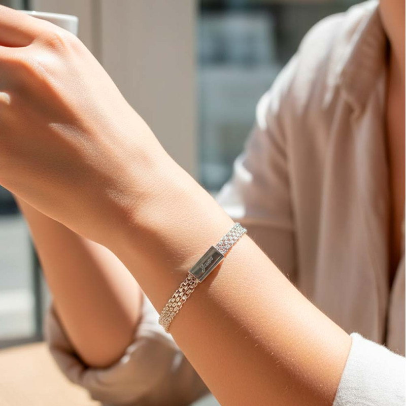 Custom Bismark bracelet made of sterling silver with three delicate chains. Choose from 1 to 3 silver plates to personalize with names, words, signatures, or drawings. Available in various sizes.