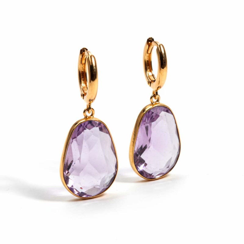 Gold earrings with oval amethyst stones measuring 18 x 13 mm. Total length 30 mm and maximum width 13 mm.