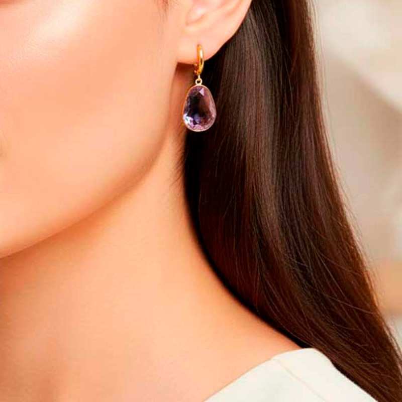 Handcrafted 18k gold earrings featuring an oval amethyst stone measuring 18 x 13 mm. The deep violet hue of the amethyst stands out against the warm tone of the gold, creating a refined and timeless design. The earrings measure 30 mm in length and 13 mm in maximum width — a perfect balance of color and shine in a handmade piece of fine jewelry.