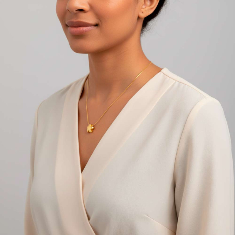 This handcrafted pendant features a delicate small double jasmine made in gold. Each flower measures 10 x 10 mm, designed to highlight the natural beauty of the piece. It comes with an elegant 1.2 mm thick, 40 cm long snake chain, ready to wear. A unique artisanal jewelry piece for those who appreciate craftsmanship and fine details.