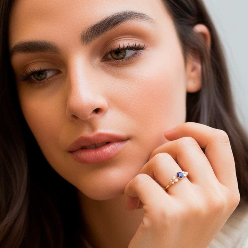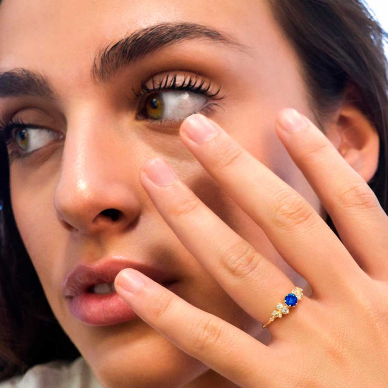 This handcrafted ring is made of 18k gold and combines the deep blue of a central sapphire with the sparkle of ten hand-set diamonds. Four of the diamonds measure 1.75 mm and six measure 1.25 mm. An exclusive jewel that showcases the artistry of fine craftsmanship in gold and gemstones.