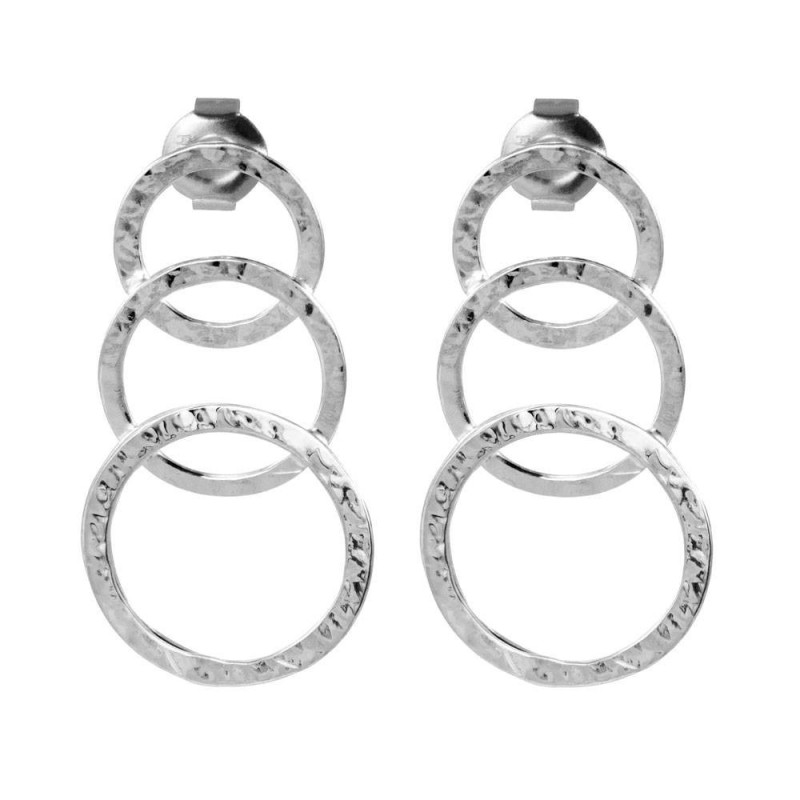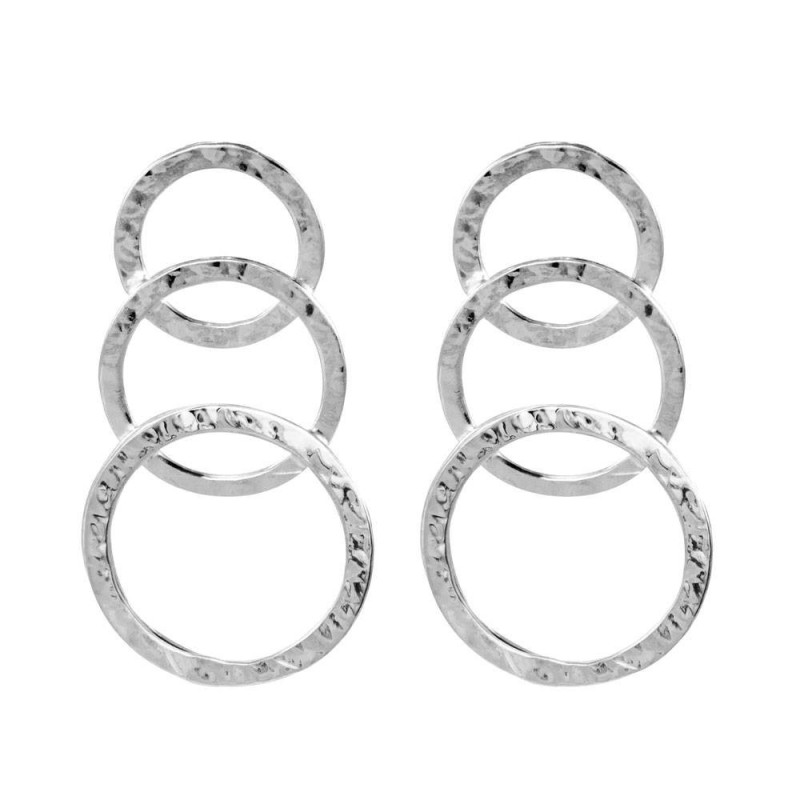 Handcrafted sterling silver earrings featuring three interlinked hoops with a hammered finish, adding texture and character to each piece.