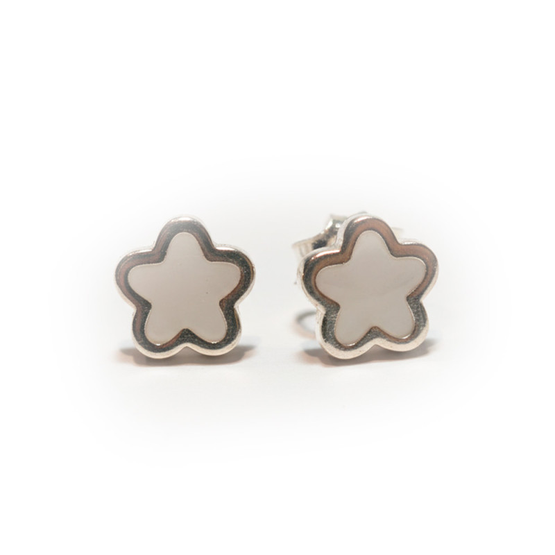 Jasmine-shaped earrings made of sterling silver, approximately 8 mm in size. Each flower is filled with white enamel, highlighting its handcrafted detail.