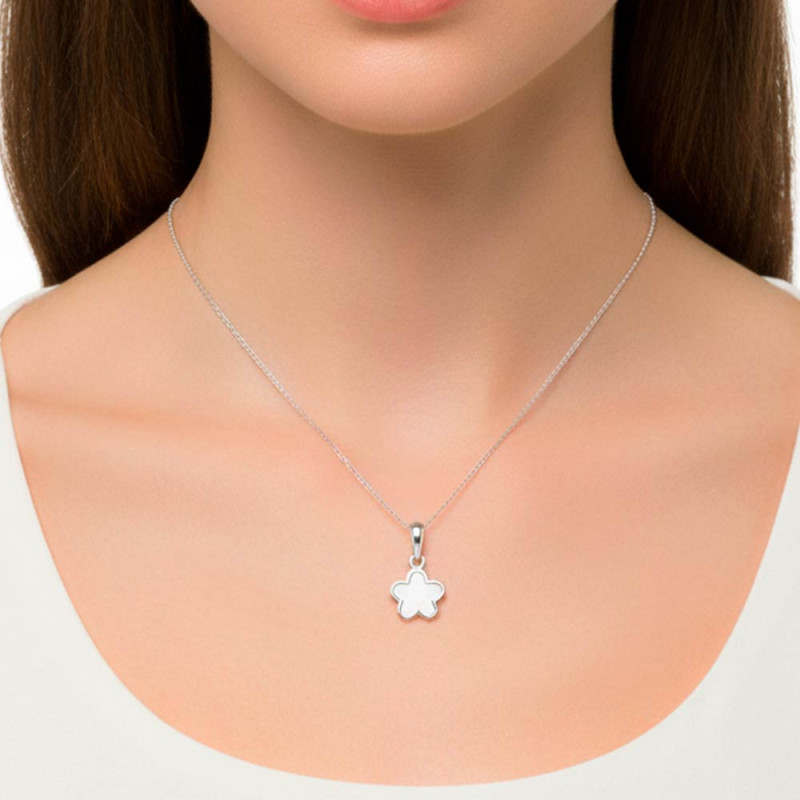Sterling silver pendant shaped like a jasmine flower, 8 mm in diameter, filled with white enamel. Available with or without a silver chain in various lengths.
