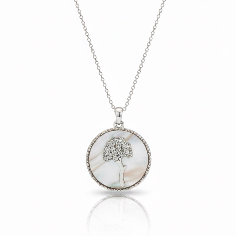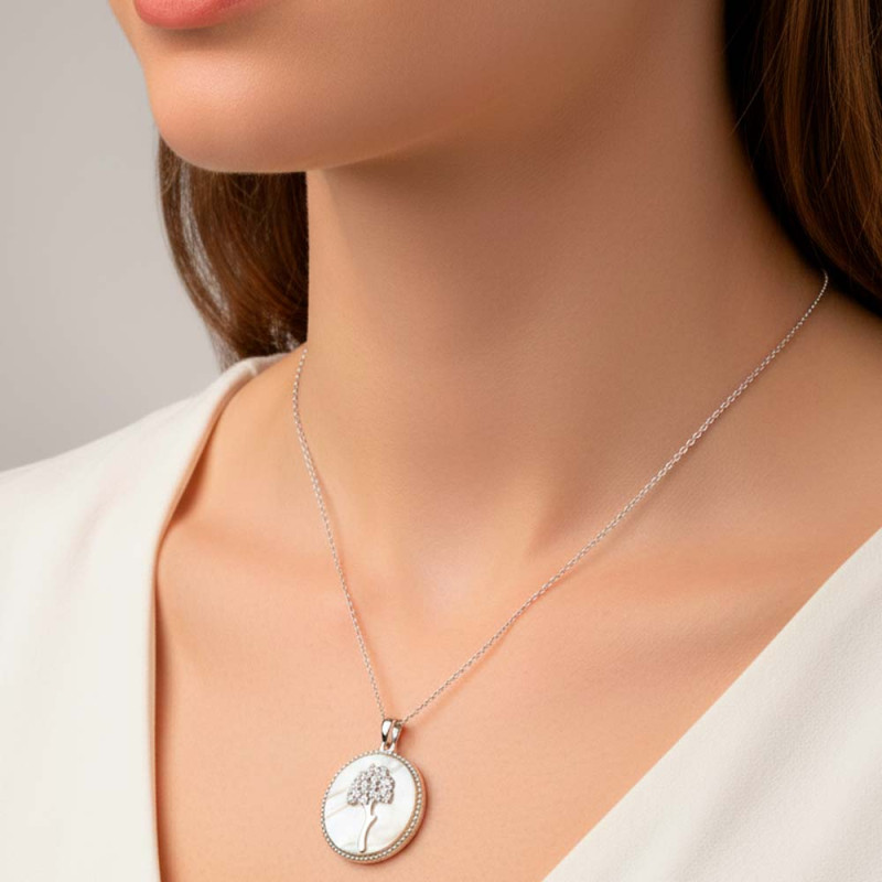 Silver pendant with a mother-of-pearl background and a central jasmine-shaped biznaga in silver. The pendant measures 20 mm in diameter and is available with or without a silver chain of 37, 42, 45, or 50 cm + 5 cm extender.
