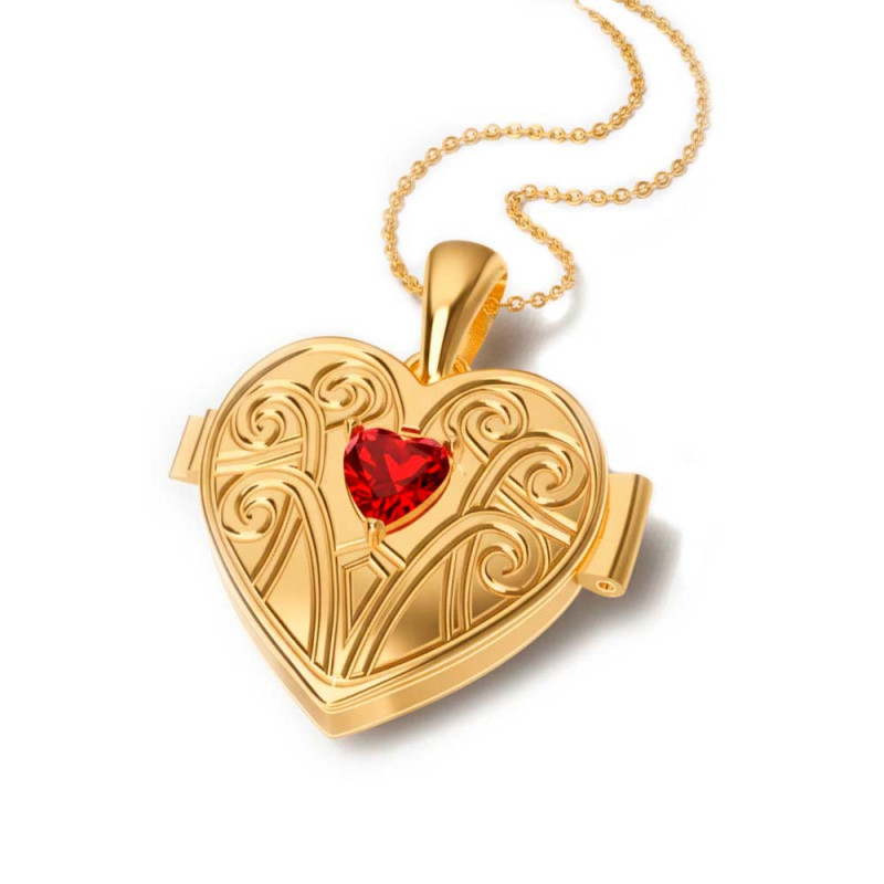 This handcrafted gold-plated silver pendant features an elegant heart design that opens and closes, perfect for keeping a small keepsake inside. At its center shines a heart-shaped ruby-colored zirconia, adding a distinctive and meaningful touch.