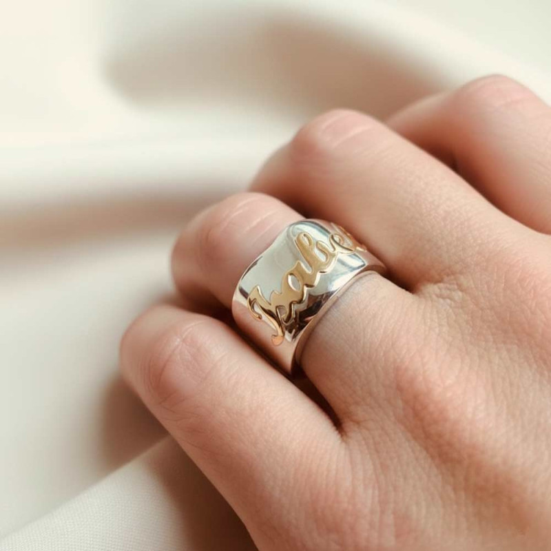 Anillo Cera Nombres Personalizados elaborado artesanalmente en plata de ley, con el nombre personalizado en oro de ley de 8 mm de altura. Con una anchura aproximada de 14,5 mm, es un regalo único y personal. Indica el nombre y tipografía deseada en la casilla correspondiente.