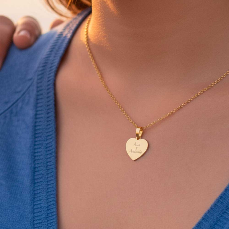 Colgante corazón en oro de 15x15 mm con cadena incluida. Personalízalo con nombre, fecha, frase o dibujo simple. Grabado trasero opcional.