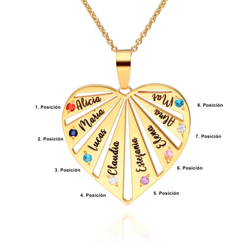 Colgante Corazón Piedras Dorado personalizado con nombres y piedras preciosas. Graba hasta ocho nombres con su piedra correspondiente para un regalo único y especial. Escribe los nombres junto a las circonitas en la posición deseada. Opciones de cadena disponibles.