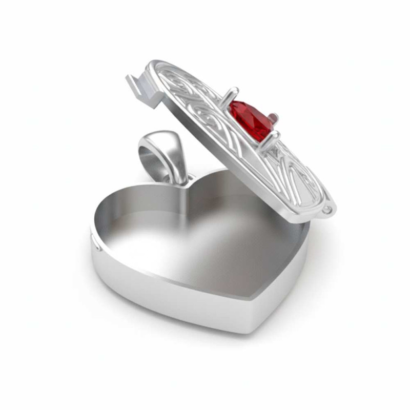 Colgante de plata de primera ley con forma de corazón, diseñado con una pequeña circonita en forma de corazón color rubí en el centro. El corazón puede abrirse y cerrarse, lo que lo convierte en una joya especial y simbólica. Disponible con cadena de plata de 37, 42, 45 o 50 cm + 5 cm de alargue, o sin cadena.
