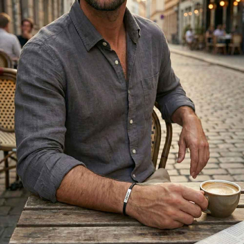 Pulsera de cuero y plata personalizable con grabado en ambas caras. Disponible en varios colores y tipografías.