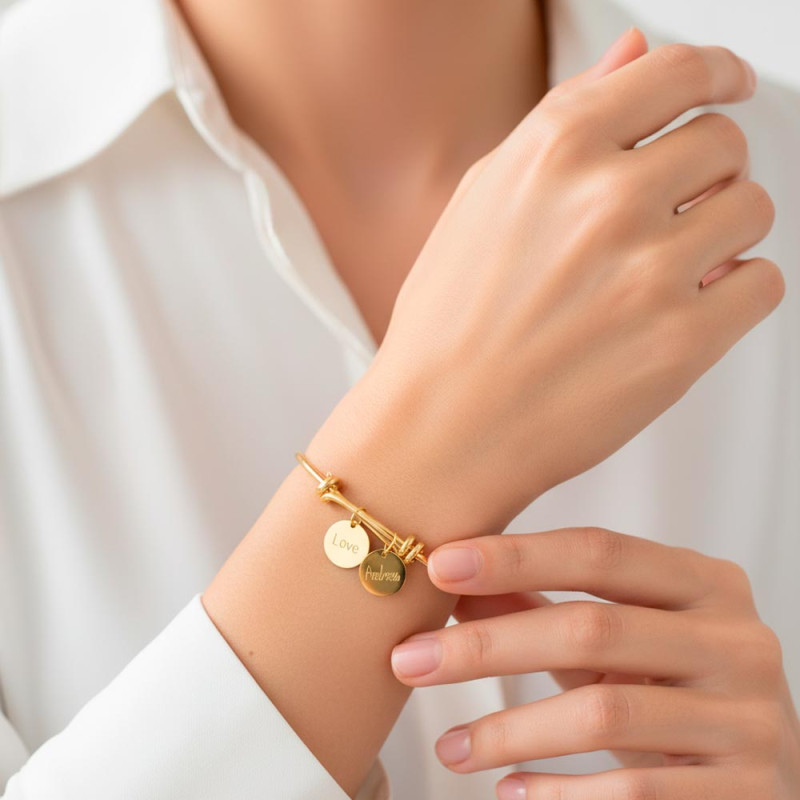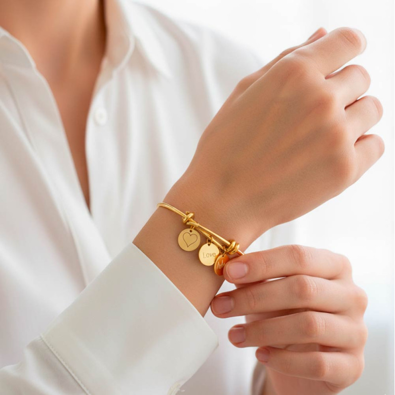 Pulsera de oro de 18k con medallas personalizadas. Elige hasta 4 medallas con nombres, palabras, fechas o dibujos. Posibilidad de grabado trasero con coste adicional.