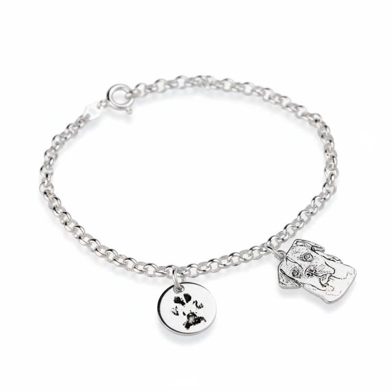 Pulsera Perro y Huella de plata de primera ley con cadena rolo 0,5. Incluye charm personalizado con la silueta de tu perro y medalla grabada con huella, nombre o fecha especial.