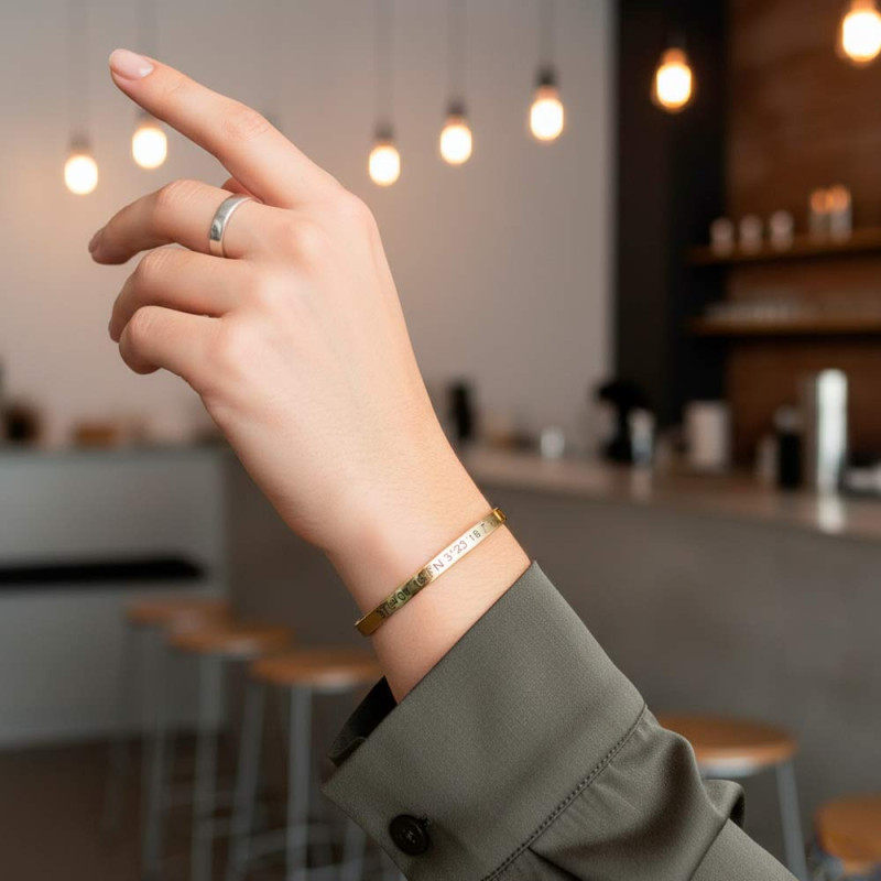 Nuestra Pulsera Coordenadas personalizadas en Plata chapada en oro es el regalo perfecto para capturar un lugar significativo. Con un tamaño de 4mm y se puede grabar por la parte delantera y también por la trasera (grabado trasero con coste adicional). Puedes grabar coordenadas, una frase especial o cualquier texto breve que desees.