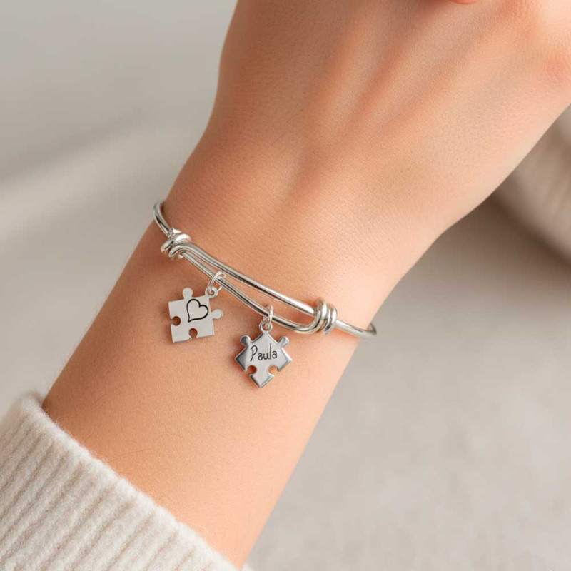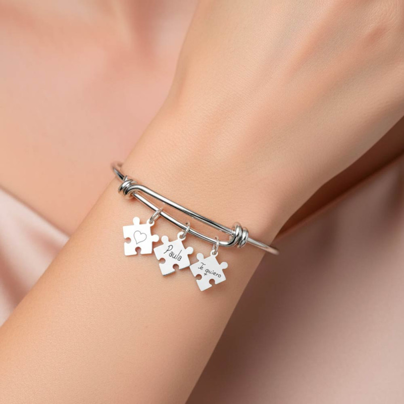 Pulsera personalizada con piezas de puzzle colgantes, hecha a mano en plata de ley. Incluye un nudo a cada lado y una pieza de puzzle grabada. Puedes elegir hasta 3 piezas con grabado delantero y trasero (opcional).