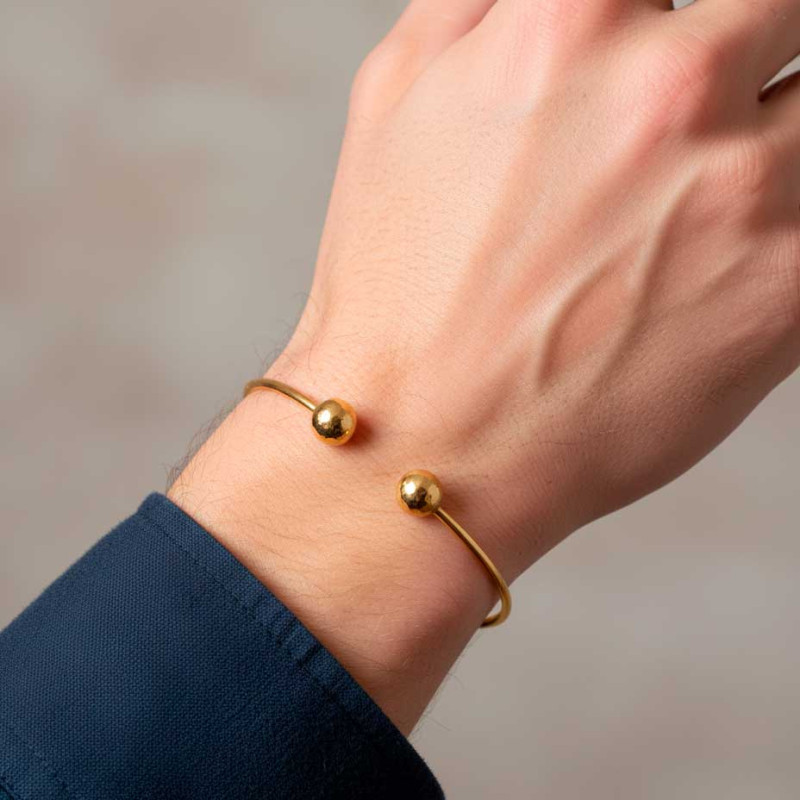 Pulsera abierta elaborada en plata de primera ley chapada en oro de 2 micras. Su diseño minimalista con dos bolas en los extremos la convierte en una pieza versátil, ideal para combinar con otras pulseras o lucir sola.
