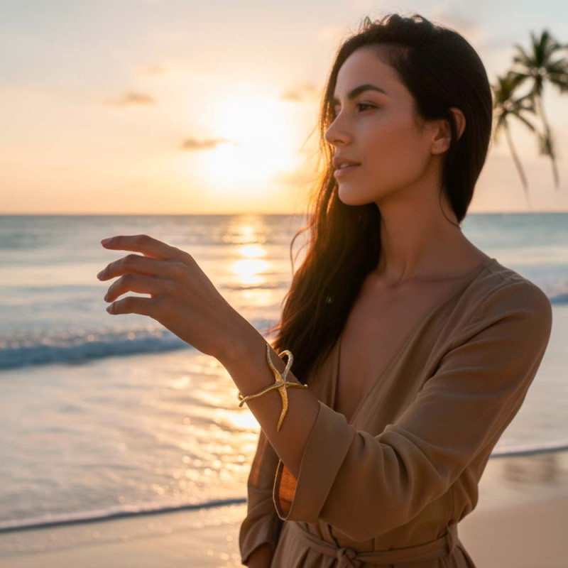 El Brazalete Dorado Estrella de Mar está elaborado en latón chapado en oro con un acabado brillante que resalta su diseño orgánico. La estrella de mar, ligeramente asimétrica, le da un toque natural que evoca la textura y movimiento del mar. Cada pieza está trabajada artesanalmente, lo que garantiza un acabado único. Ideal para quienes buscan joyas hechas a mano con detalles inspirados en la naturaleza marina.